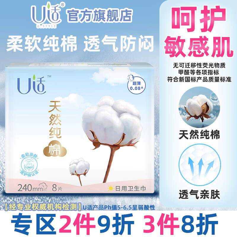 U适卫生巾日用 新升级丝薄纯棉护翼姨妈巾240mm*8片亲肤超吸