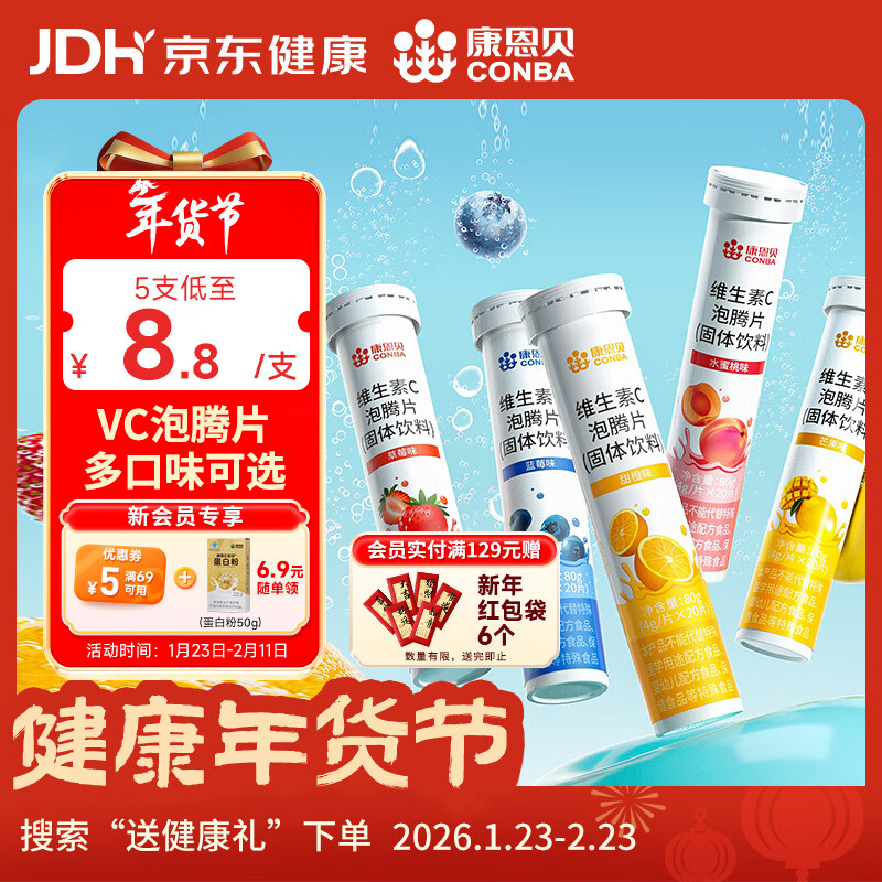 康恩贝 维生素C泡腾片 维他命VC泡腾片 维C固体果味饮料 多口味可选 主款 5种口味 20片*5支