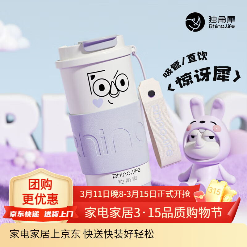 独角犀保温杯咖啡杯陶瓷内胆高颜值大容量水杯男女学生情侣杯母亲节礼物 惊讶犀-白色【陶瓷覆层】 500ml