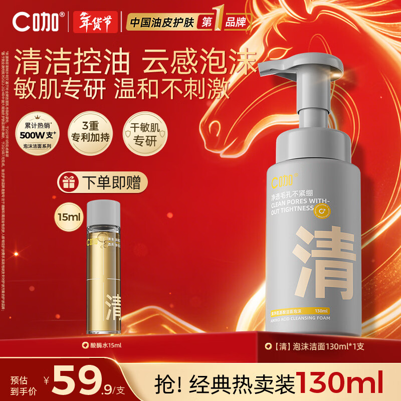 C咖清洁氨基酸泡沫洗面奶温和清洁净肤控油保湿男女洁面慕斯 【热卖爆款】清净洁面泡沫130ml*1