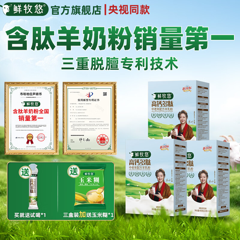 鲜牧悠高钙多肽羊奶粉老年人中老年成人配方奶粉乳源百分百纯羊乳送父母 400g*3盒(送试喝*1+玉米糊*1)