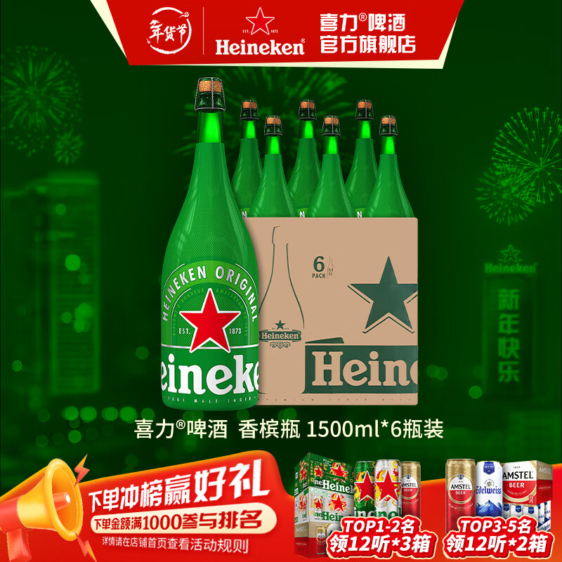 喜力香槟瓶 荷兰进口啤酒 原麦汁浓度≥11.4°P 1.5L 6瓶 整箱装