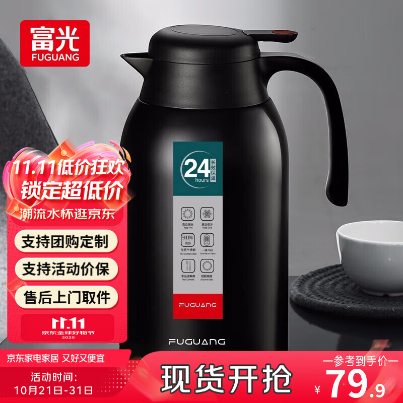 富光 保温壶家用热水瓶开水瓶大容量不锈钢保冷壶家用保温咖啡杯壶 炫酷黑 2200ml