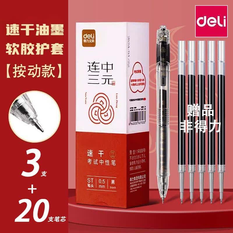 得力(deli)透明考试用笔高考中考学生用中性笔速干st头V1连中三元刷题事业编考研考公备考0.5mm按动笔备考用 【超值推荐】3支笔+20支替芯
