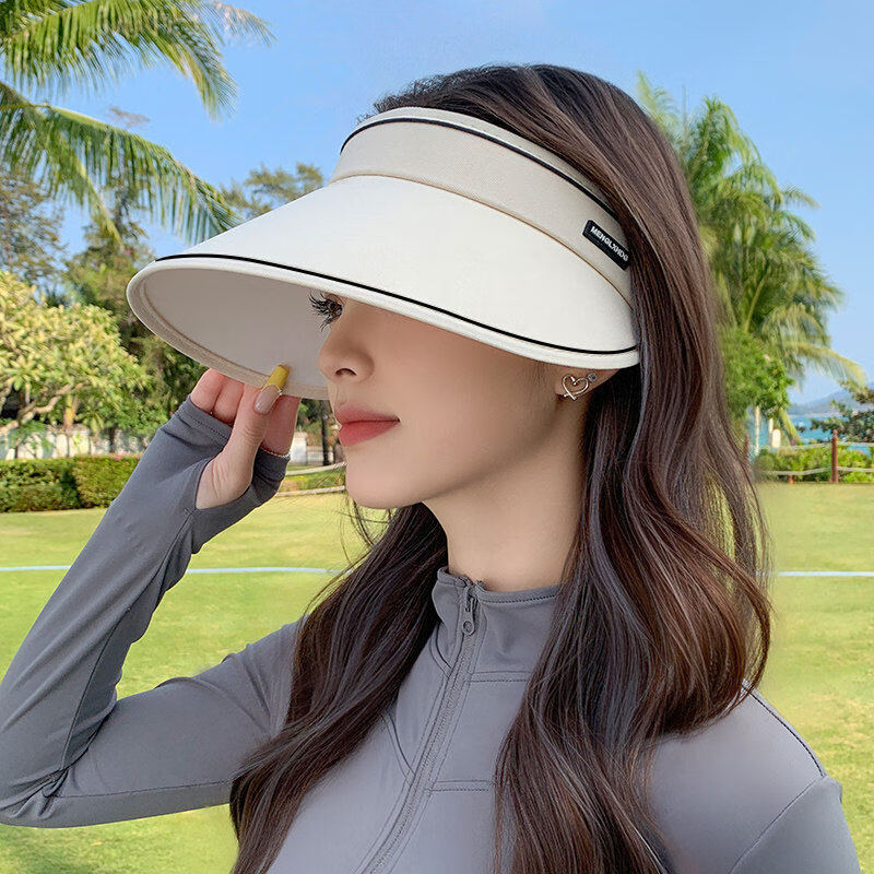 万宝绿防晒帽子女士夏天防紫外线太阳帽户外遮脸大帽檐空顶遮阳帽 白胶底-浅杏色【可折叠·可调头围】 可调节