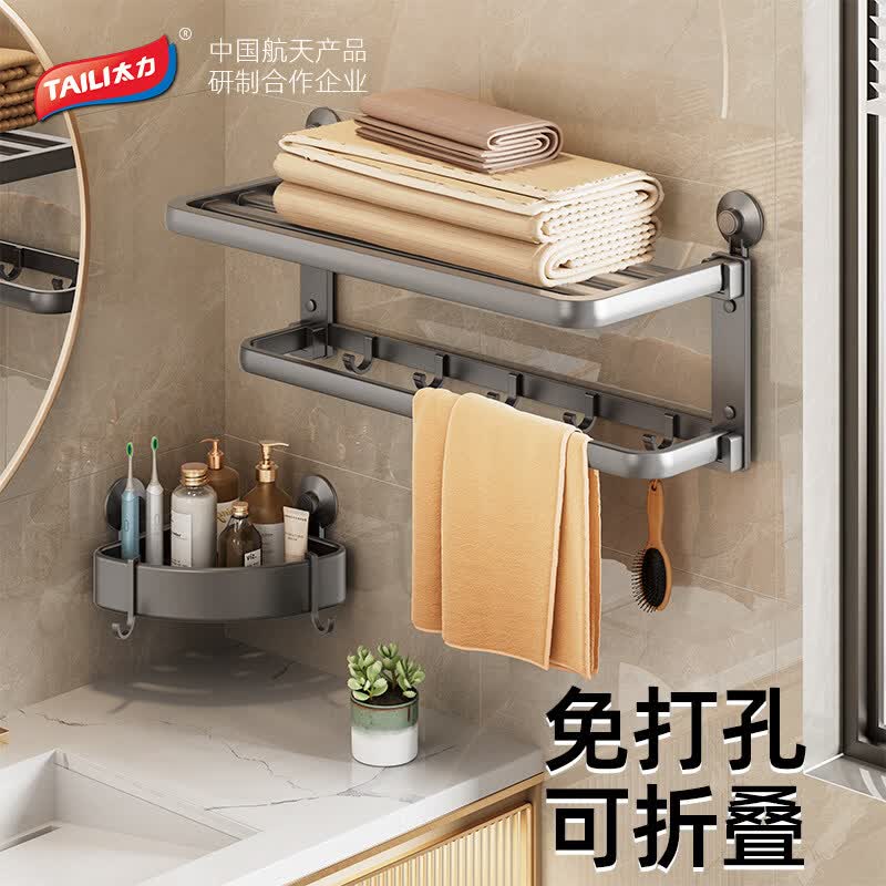 太力卫生间置物架吸盘壁挂式免打孔毛巾架浴室洗漱台厕所无痕收纳架 【秒安装/太空铝】浴巾架 63cm
