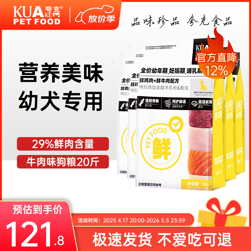 夸克狗粮鲜肉幼犬专用泰迪比熊金毛柯基小型犬通用型犬粮 【鲜鸡肉牛肉配方】幼犬专用粮20斤