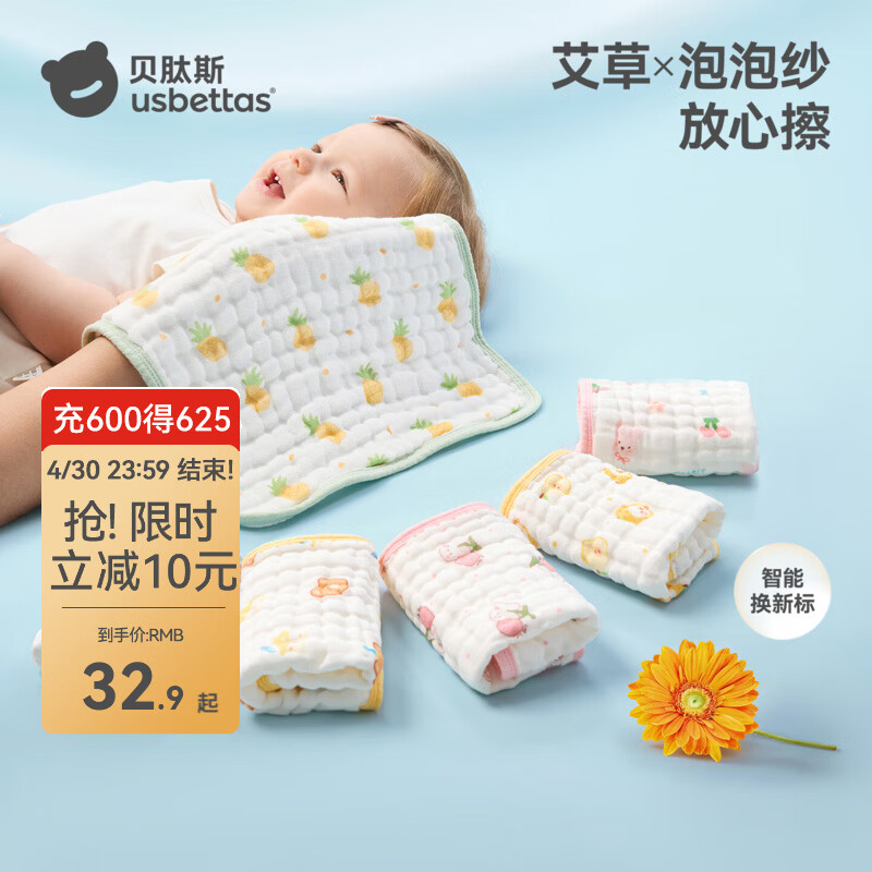 贝肽斯口水巾婴儿A类毛巾新生儿宝宝纱布围嘴小方巾洗脸洗澡巾 3条装-田间小象【4层柔纱】 30x30cm