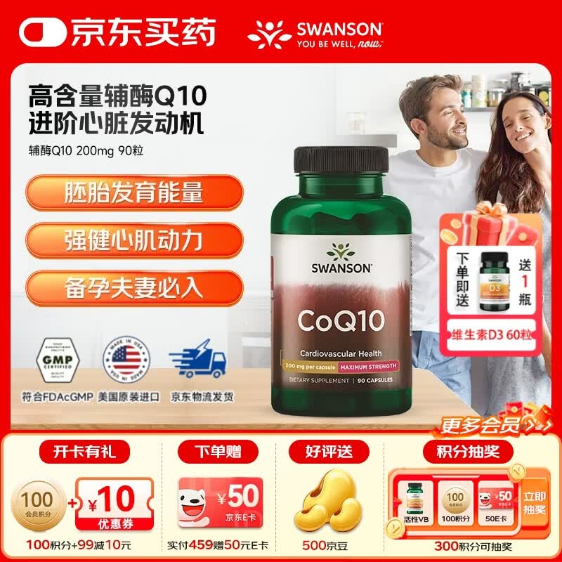 斯旺森(SWANSON)辅酶Q10备孕专用 高浓度中老年强健心肌缓解心慌心悸心脑血管 【呵护心脑】高含量辅酶200mg 90粒*1瓶