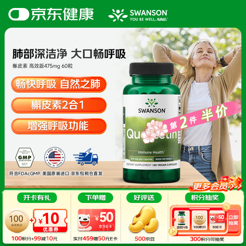 斯旺森(SWANSON)槲皮素肺部动力保养养肝清肺呼吸顺畅抗氧化清除自由基 槲皮素 高效版475mg 60粒【效期至26/9】