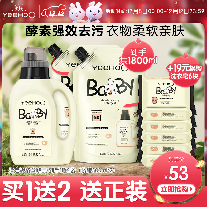 YEEHOO婴儿洗衣液宝宝专用洗衣皂液儿童内裤洗液天然酵素去污柔护洗衣液 柔护洗衣液800ml*1+500ml*2