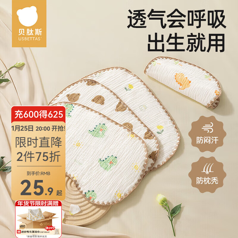 贝肽斯新生儿云片枕头婴儿春秋0到6个月宝宝吸汗透气纯棉纱布枕巾 小熊头【10层纱布,云柔透气】
