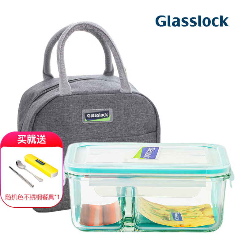 GLASSLOCK 进口耐热钢化玻璃保鲜盒便当饭盒可微波加厚耐摔硅胶圈颜色随机 蓝圈|分隔1000ml+便当包包