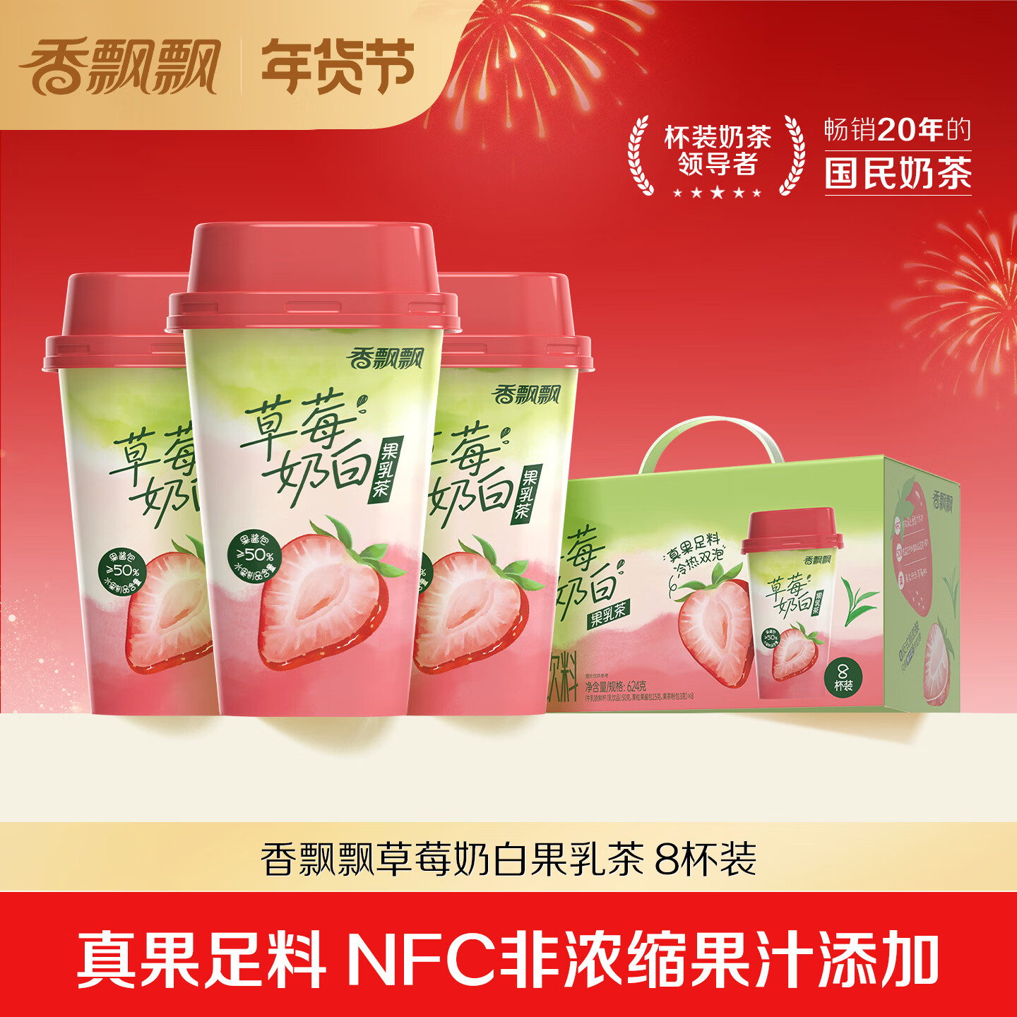香飘飘果乳茶 丹东草莓NFC果汁0反式奶茶下午茶聚会整箱年货礼盒 草莓奶白果乳茶-8杯装624g