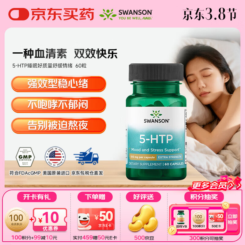 斯旺森(SWANSON)L-5htp羟基色氨酸100mg血清素60粒改善睡眠平静舒缓情绪 缓解焦虑 【强效型稳心绪】血清素5-HTP 60粒*1瓶
