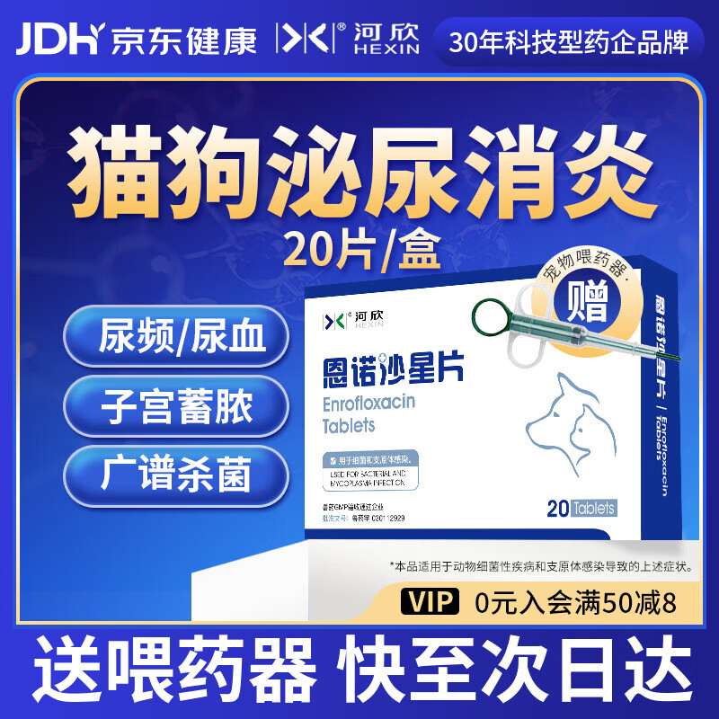 河欣宠物恩诺沙星片拜有利尿通猫咪狗狗消炎泌尿道膀胱支原体子宫蓄脓 20片*1盒 恩诺沙星片(抗菌消炎 送喂药器)