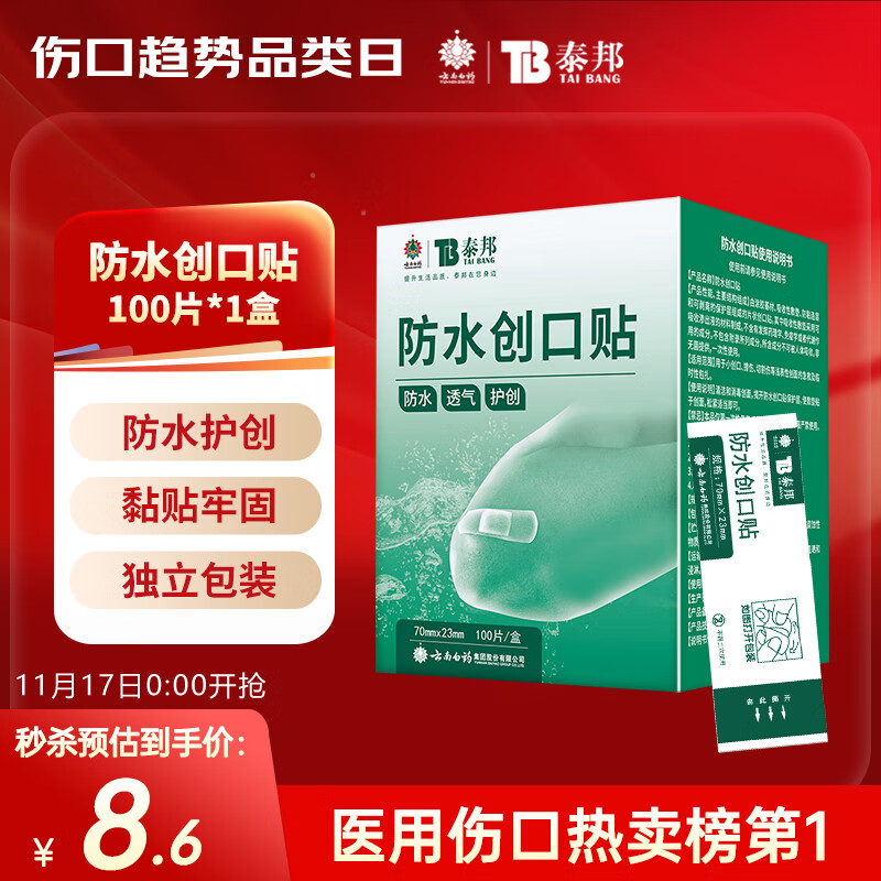 云南白药泰邦防水创口贴 轻巧透气皮外伤擦伤创可贴防磨脚贴 100片