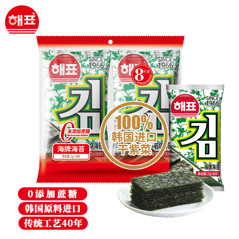 海牌菁品韩国进口经典原味海苔2g*6包儿童休闲香脆紫菜非油炸即食零食