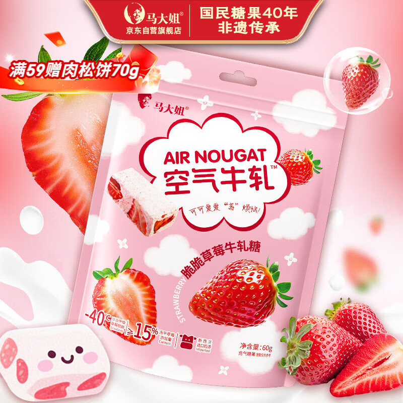 马大姐 牛轧糖 60g约14颗 草莓空气软牛轧儿童酸甜水果糖果 雪花酥 零食