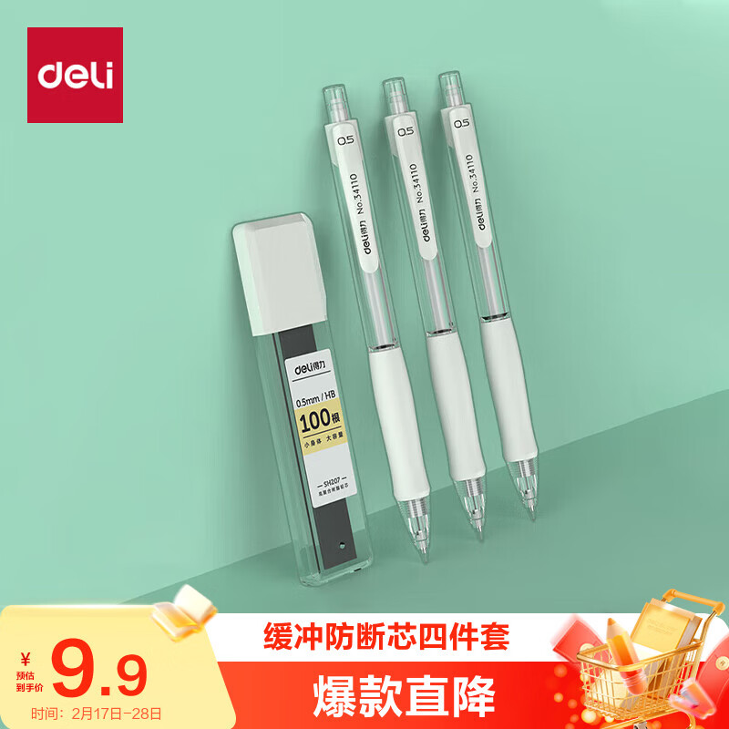 得力(deli)手护者大面积护套书写不累手 缓冲防断芯自动铅笔0.5mm(3笔 1铅芯) 白色 34110