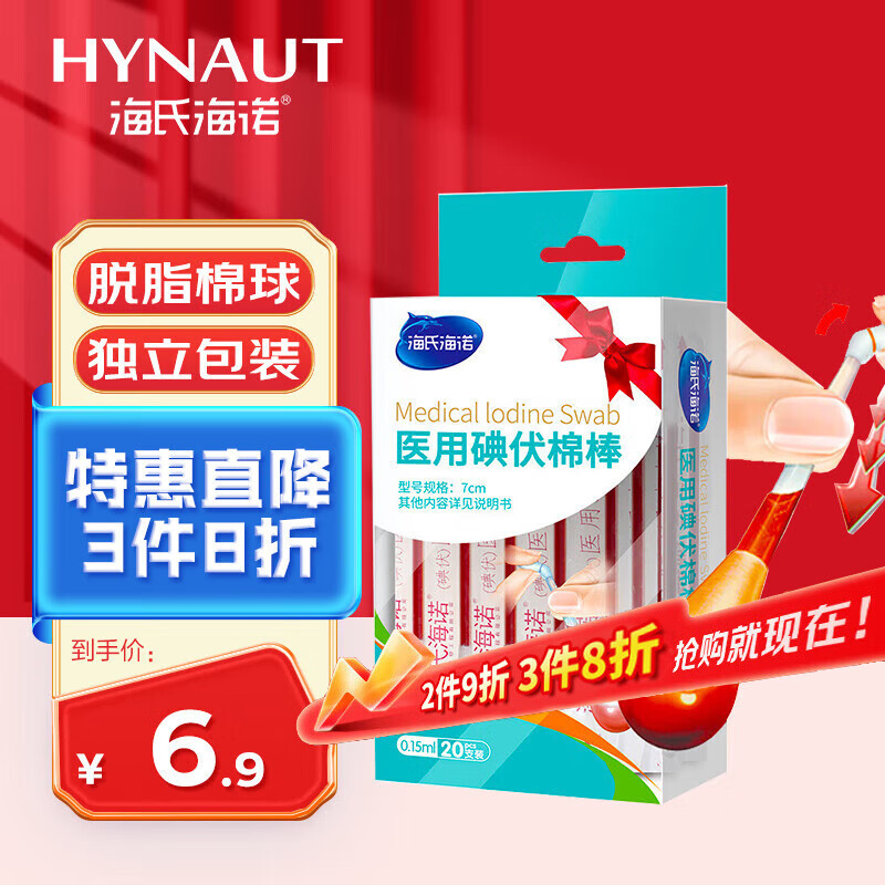 海氏海诺 医用碘伏棉棒7cm 医用碘伏消毒液棉签棒 20支装(独立包装)