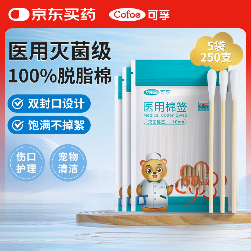 可孚医用棉签无菌消毒脱脂棉棒一次性清洁伤口护理掏耳朵5袋250支