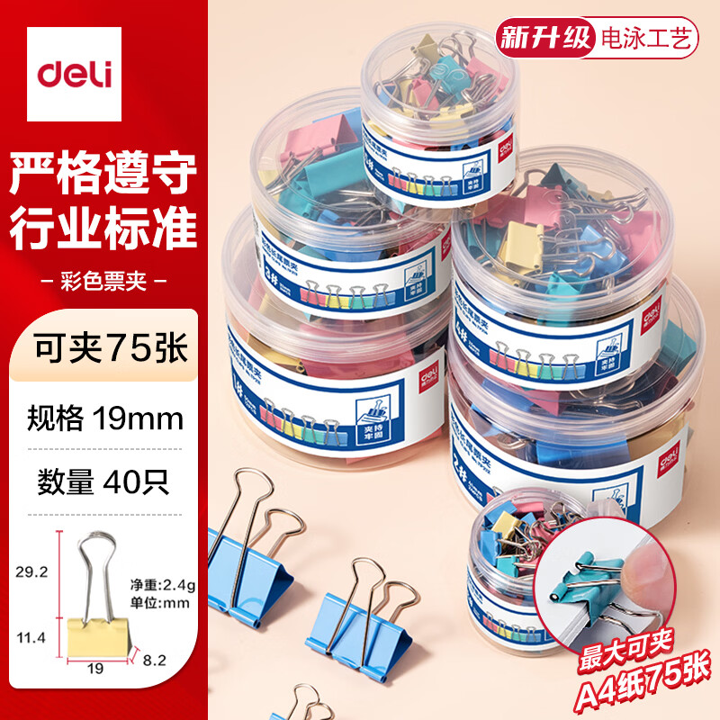 得力(deli)票夹19mm40只彩色长尾票夹燕尾夹小号大号书夹办公用品资料夹凭证夹票据夹试卷夹科目夹TP215