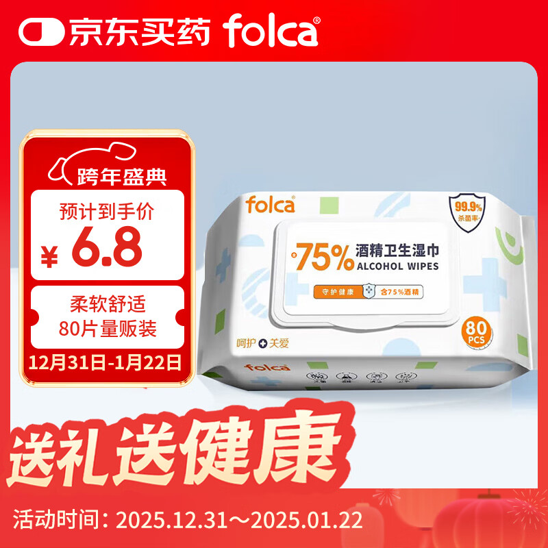 folca 含75%浓度酒精湿巾80片 杀菌湿巾卫生湿巾消毒湿巾酒精棉片