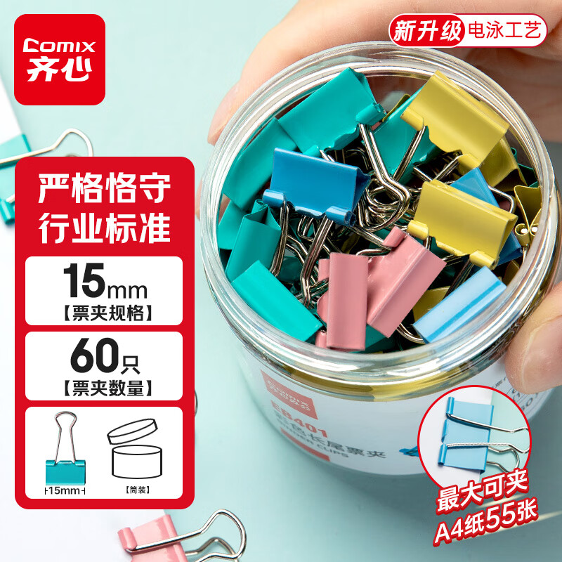 齐心(COMIX)【超级爆款】60只15mm长尾夹票夹 6#小号燕尾夹 彩色金属票据文件夹子文具办公 60只/筒 EB401