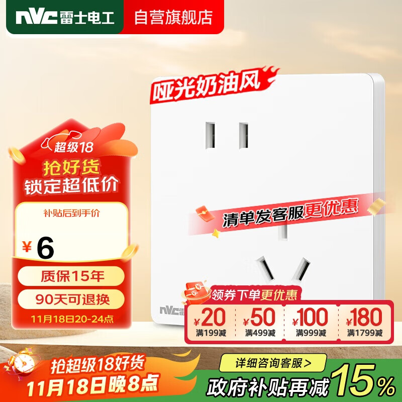 NVC雷士电工 开关插座 10a斜五孔插座 86型暗装插座面板 N25奶油白