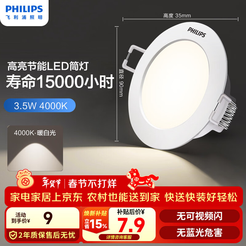 飞利浦(PHILIPS)筒灯3.5W嵌入式客厅超薄护眼灯开孔70-80mm4000K