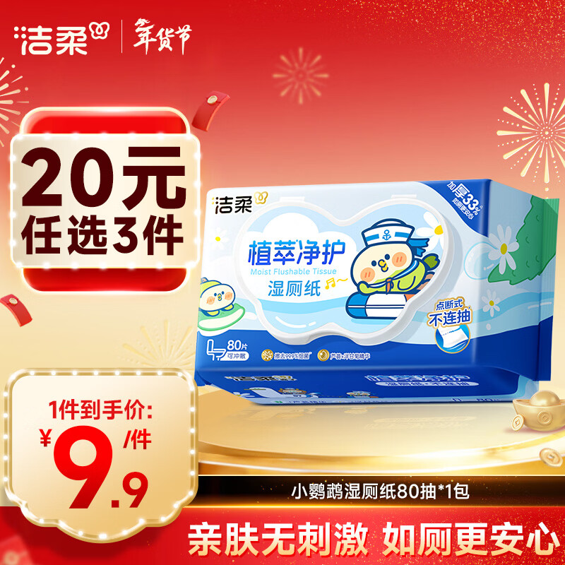 洁柔湿厕纸小鹦鹉80抽湿巾纸湿厕亲肤清爽速干加大加厚无酒精配卷纸