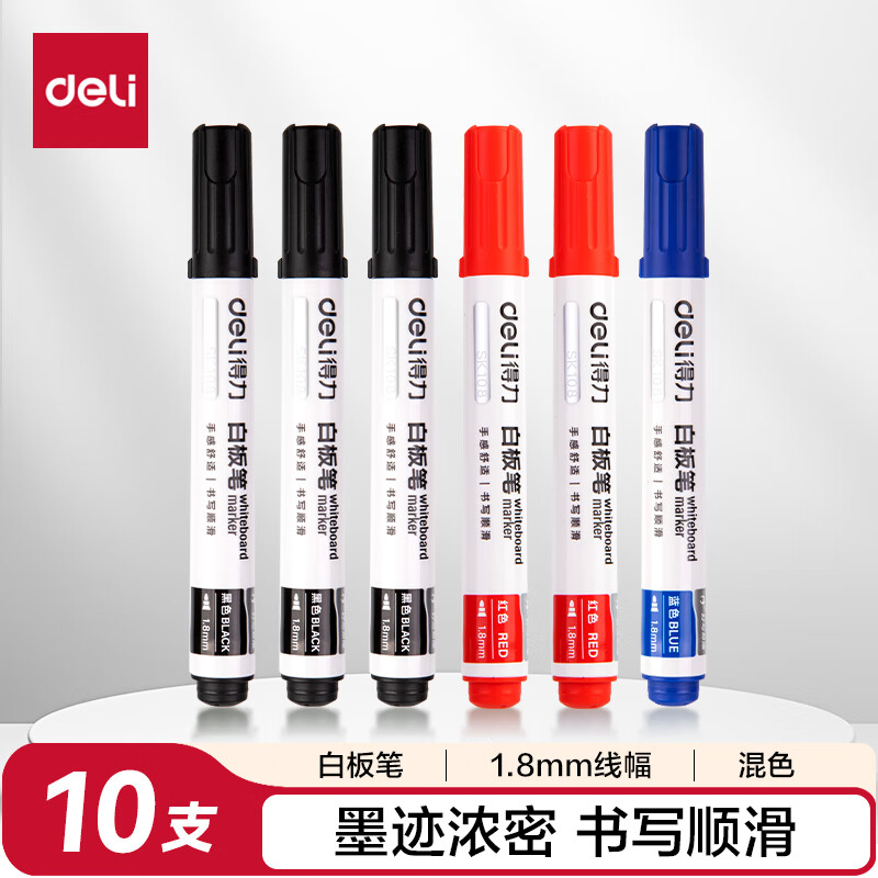 得力(deli)可擦白板笔 单头易擦书写顺滑 办公文具会议教学 5黑3红2蓝混色 10支/盒 SK108-10