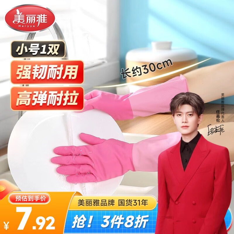 美丽雅家务手套1双小号加长30cm加厚洗碗洗衣厨房乳胶胶皮防油防护手套
