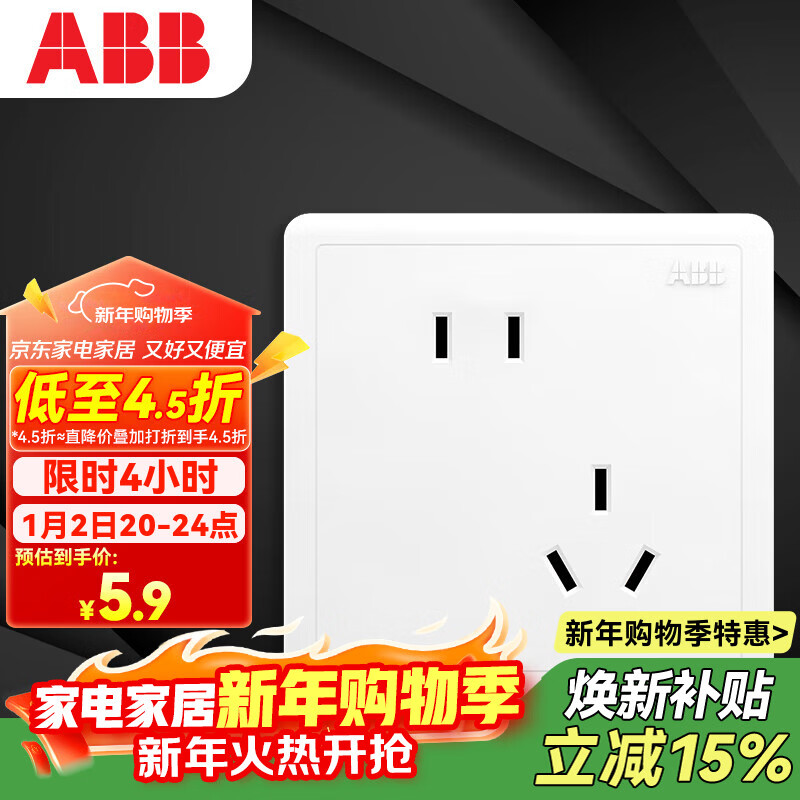 ABB开关插座面板 86型10A错位斜五孔插座 远致系列 白色