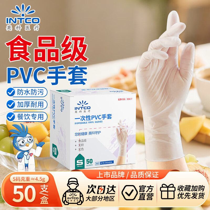 英科医疗一次性PVC手套 食品级家务清洁洗碗手套 加厚耐磨 S码 50只/盒
