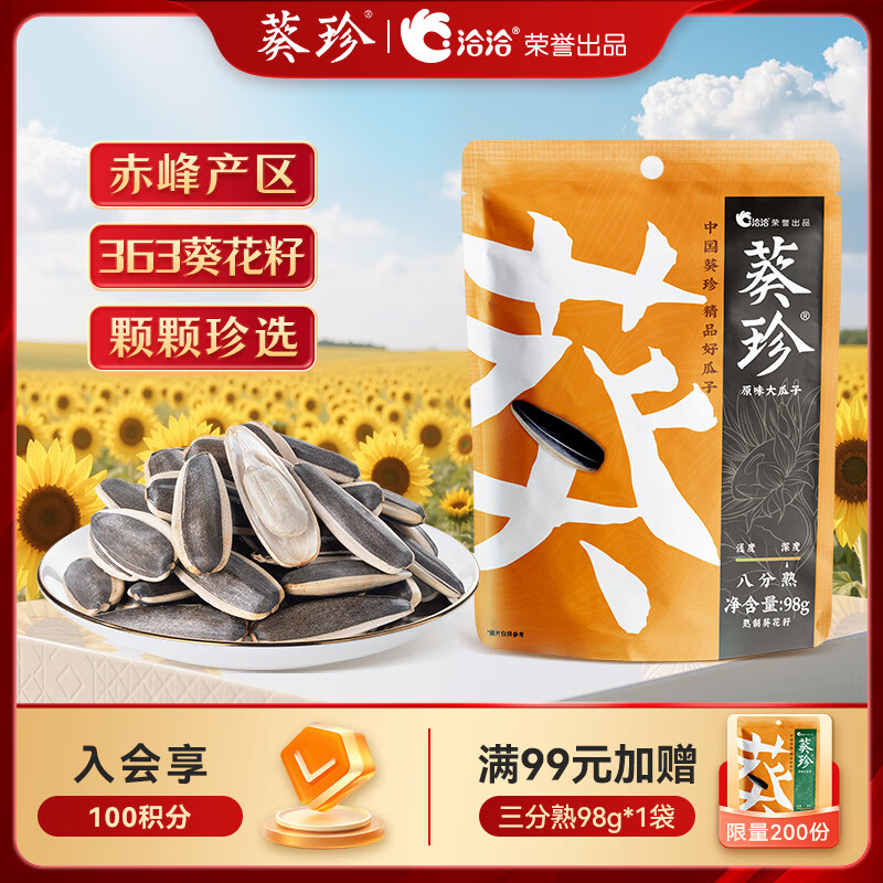 葵珍恰恰高端原味大瓜子葵花籽八分熟98g休闲零食大礼包颗粒均匀