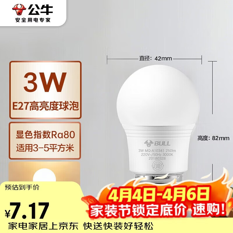 公牛(BULL)LED灯泡E27螺口球泡灯 3W球泡黄光(暖白光)3000K