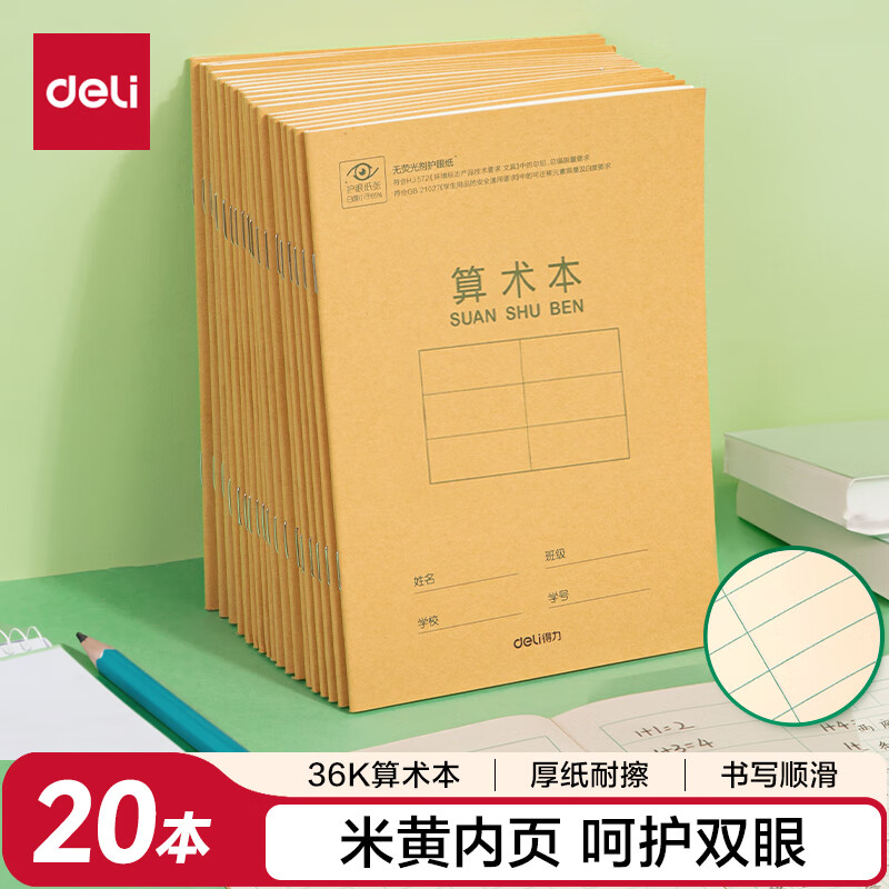 得力(deli)36K18张11行小学生算术本作业本软抄本笔记本子文具必备 20本装D3620
