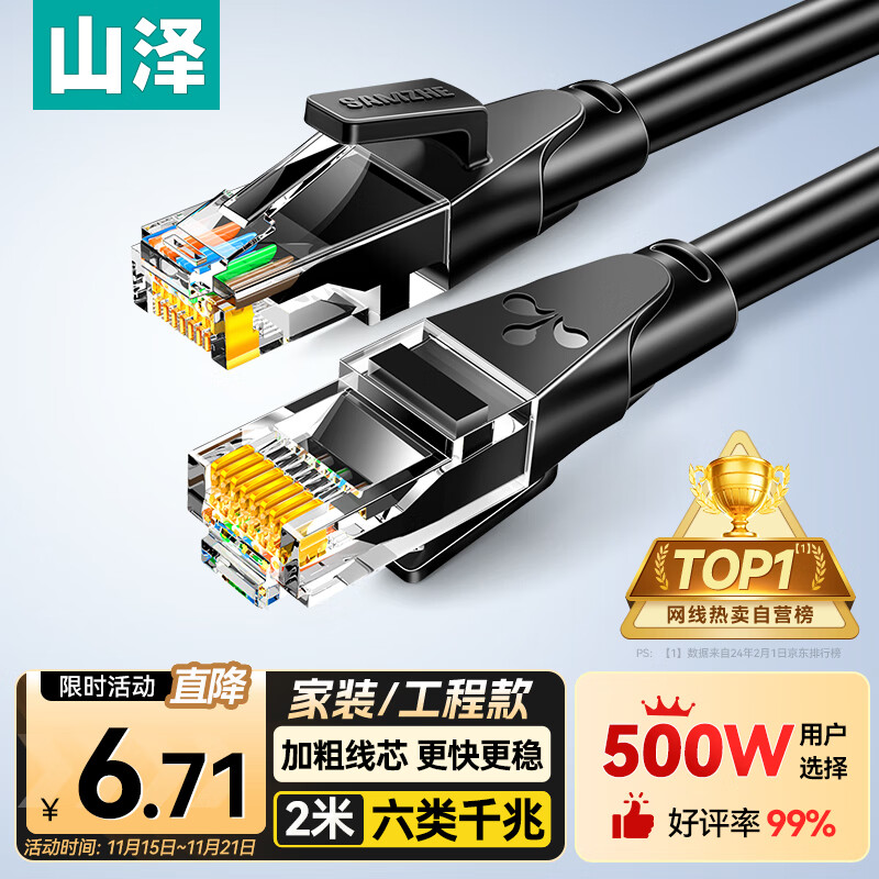 山泽 六类网线 2米千兆高速宽带线 CAT6类家用电脑路由器5g网络工程监控线8芯成品跳线2.5g黑色 WD6020