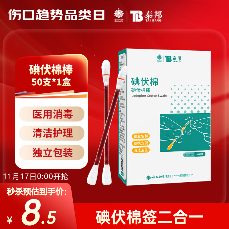 云南白药泰邦碘伏消毒棉棒 新生儿婴儿肚脐消毒护理碘酊碘酒棉签 50支