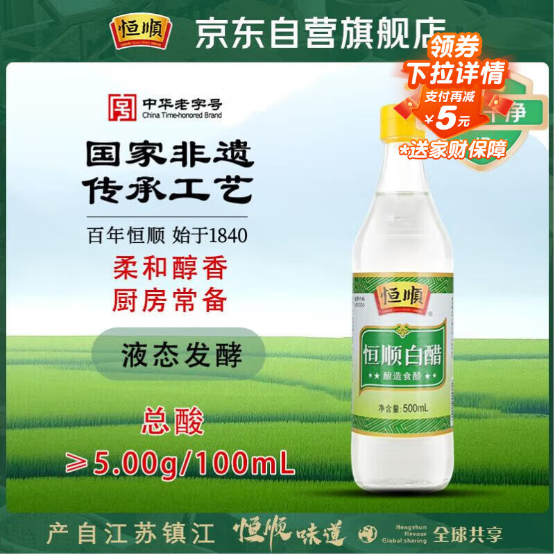 恒顺白醋 5度 500ml 凉拌提味炒菜腌制 酿造食醋 不添加防腐剂