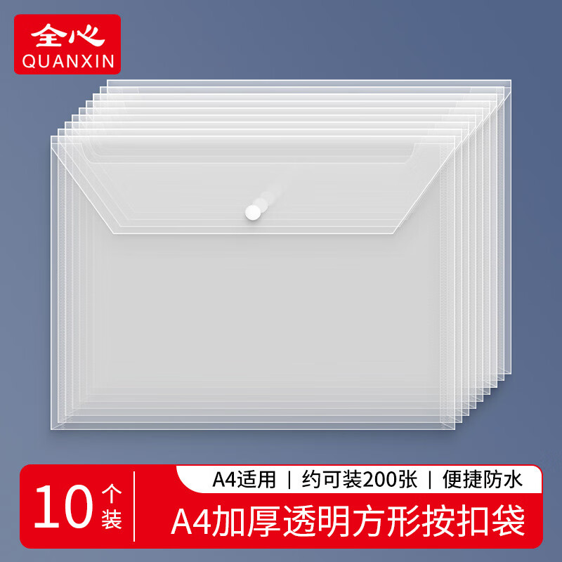 全心 10只装加厚A4透明文件袋按扣袋纽扣袋学生试卷合同档案资料防水收纳袋 2098