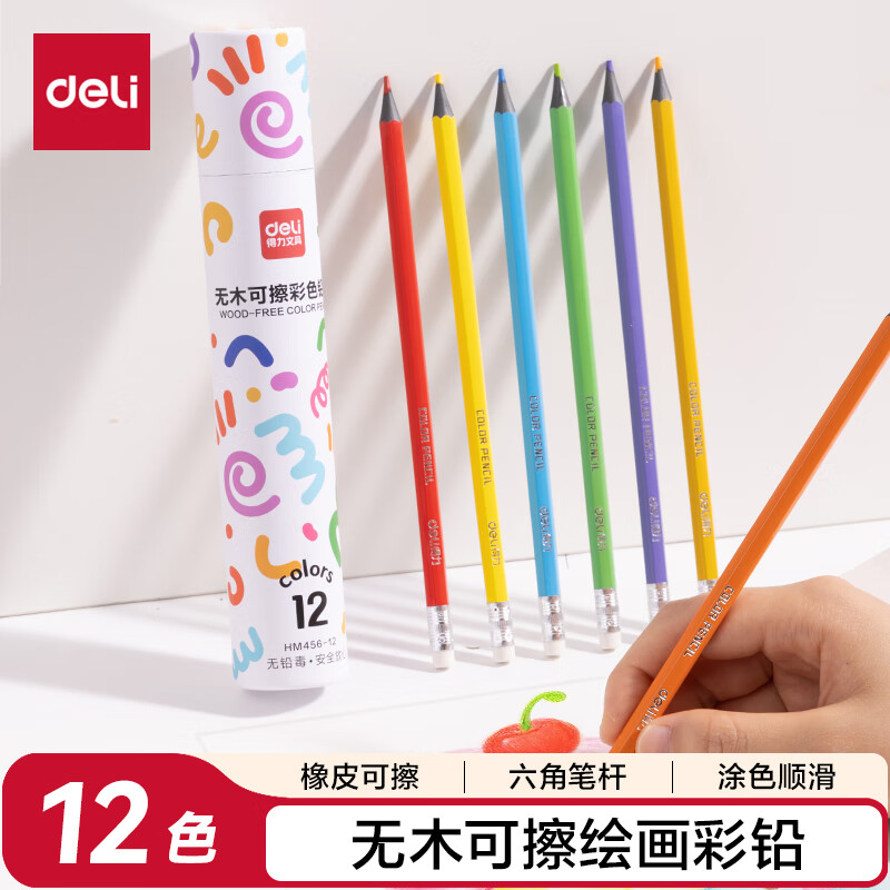 得力(deli)12色六角杆皮头可擦彩铅作业涂色美术绘画儿童涂鸦手绘易洗可擦女孩儿童礼物HM456-12彩笔