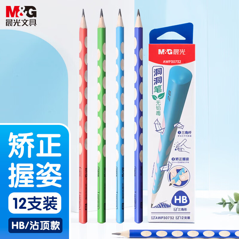 晨光文具洞洞铅笔彩杆12支HB 小学生练字铅笔 儿童正姿矫姿 三角木杆铅笔 沾顶易抓握AWP30732