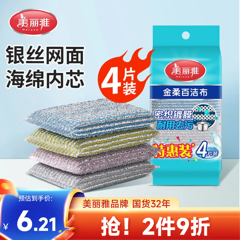 美丽雅洗碗海绵4块百洁布钢丝抹布洗碗不掉丝去油污刷厨具厨房家用神器