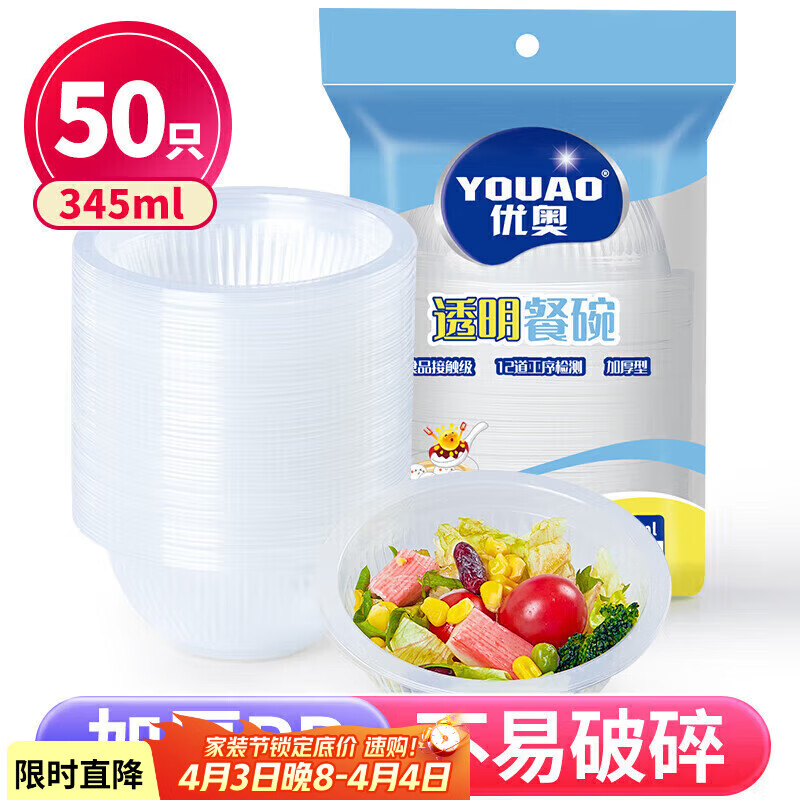 优奥一次性碗345ml*50只加厚透明饺子汤圆汤碗户外野餐露营餐具免洗