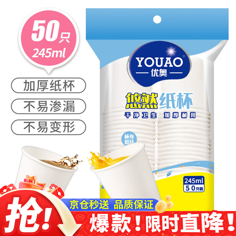优奥(YOUAO) 纸杯一次性杯子50只装245ml加厚型办公商务家用