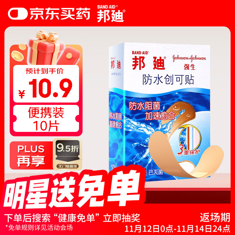邦迪创口贴防水创可贴70mm*22mm*10片/盒防水阻菌后跟帖家庭出游常备