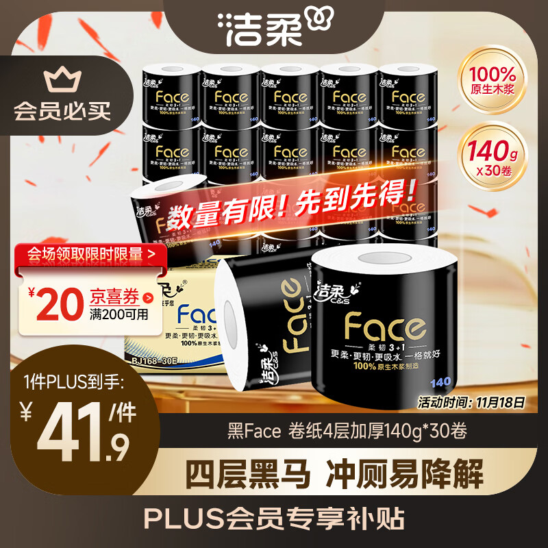 洁柔有芯卷纸 黑Face4层140克*30卷 厚韧耐用 卫生纸卷筒纸纸巾整箱